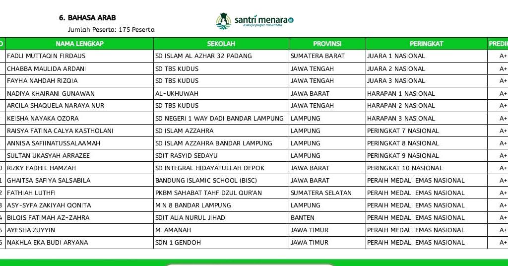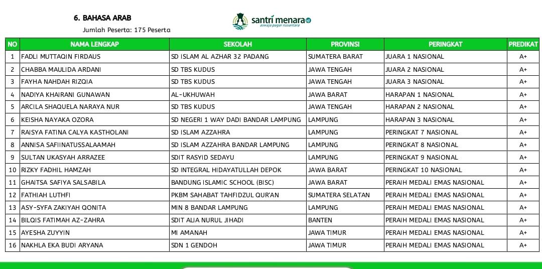 Pada cabang Bahasa Arab, yang dilaksanakan pukul 14.10–15.10 WIB, siswi SD TBS berhasil menembus podium nasional. Chabba Maulida Ardani meraih Juara 2 Nasional, disusul Fayha Nahdah Rizqia sebagai Juara 3 Nasional, serta Arcila Shaquela Naraya Nur sebagai Harapan 2 Nasional. Capaian ini menegaskan bahwa pembinaan Bahasa Arab di SD TBS tidak hanya berjalan secara rutin, tetapi juga berorientasi pada kualitas dan daya saing tingkat nasional.